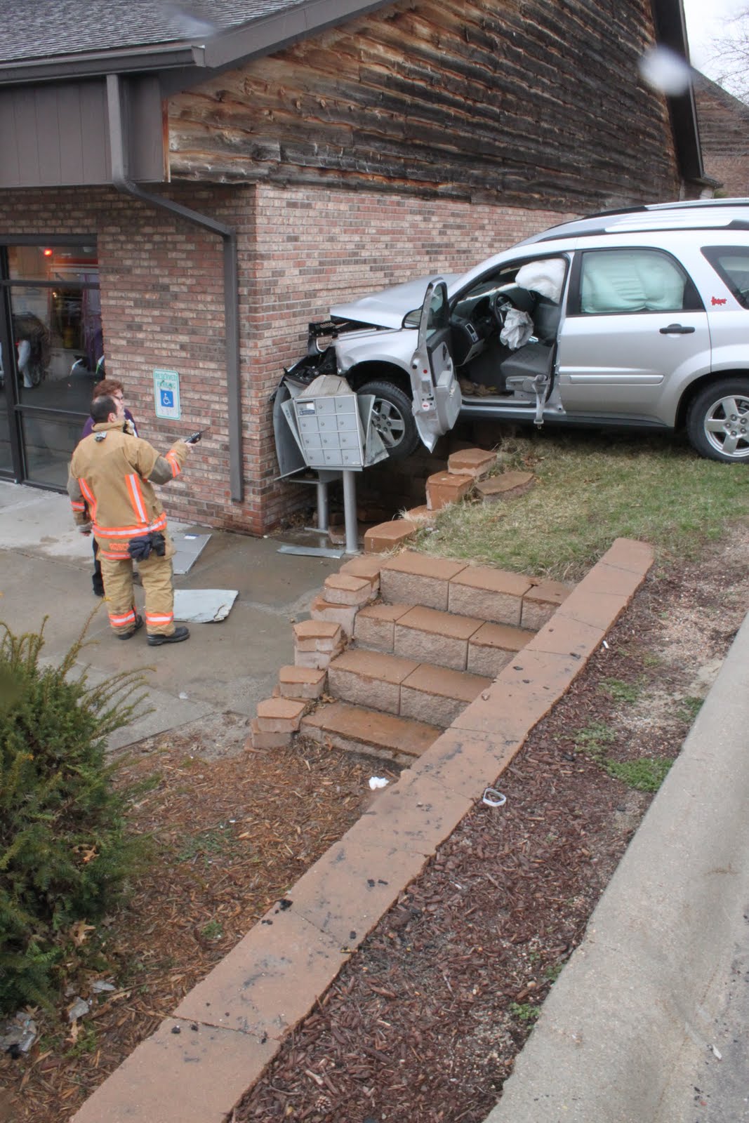 She also hit the next black car, crushed the mailboxes and hit the building next to our building. You can see that all of her airbags deployed so I don’t think she was hurt too badly. It took two tow trucks to get her car out of there. One had to lift up the front end while the other pulled the car back. She hit the wall hard enough to crack the brick and make it bow in.