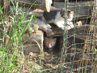 Our kitties are about ready to find a new home.  They are big enough to eat and drink out of bowl.  They love to hang out around the wood pile. It gives them some security to be behind the rolls of wire fence and hide out in the stacked wood when the dogs come around.  Priss has done a good job with them.