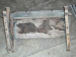 We picked up an old wagon seat at an auction and Ken used the boards as a pattern to do the seat. He cleaned all the metal off and painted it. This is the Before. Check out the After . . . .