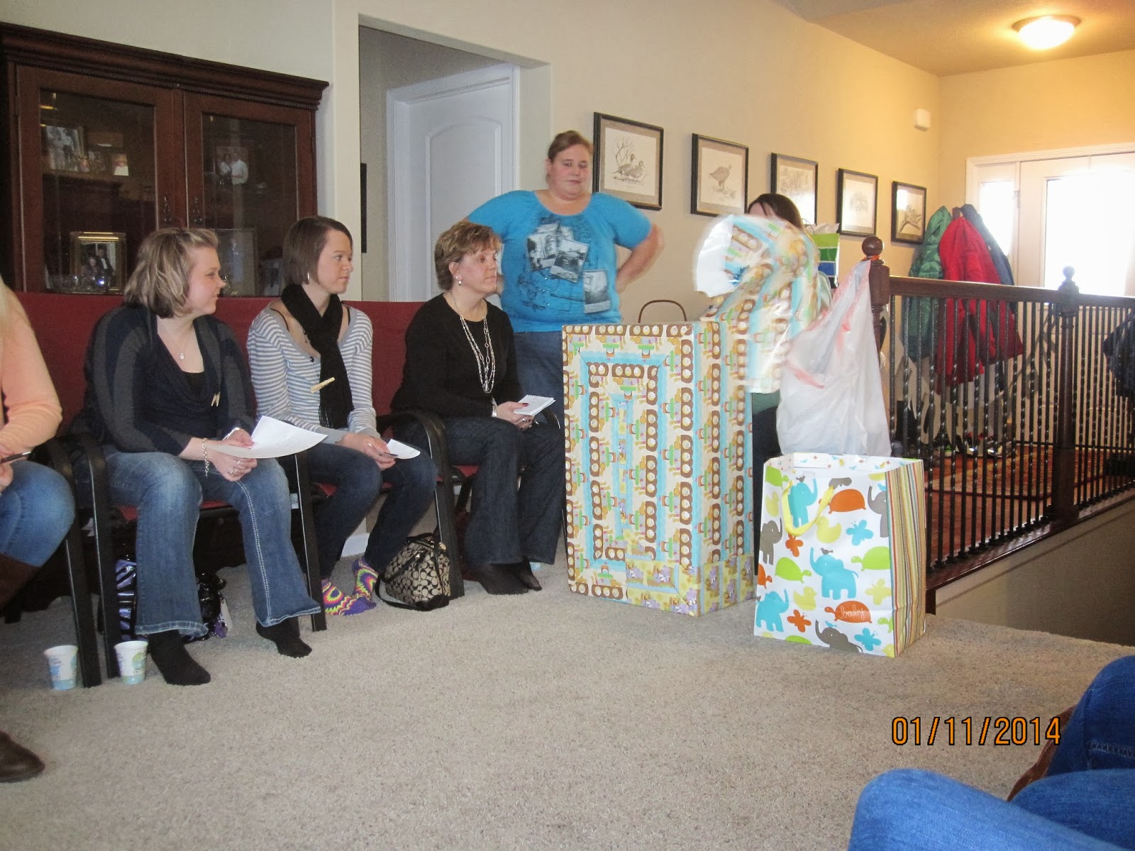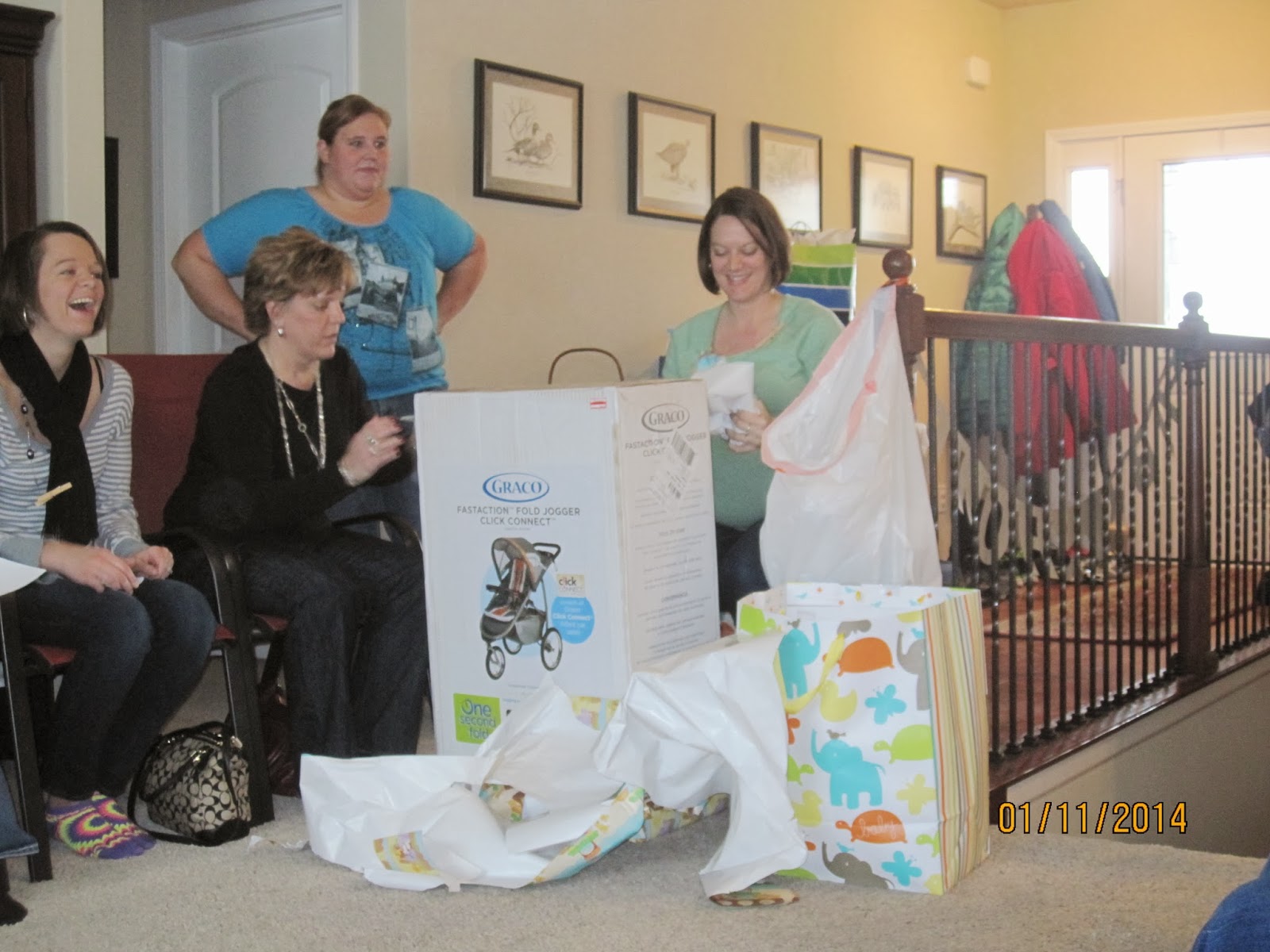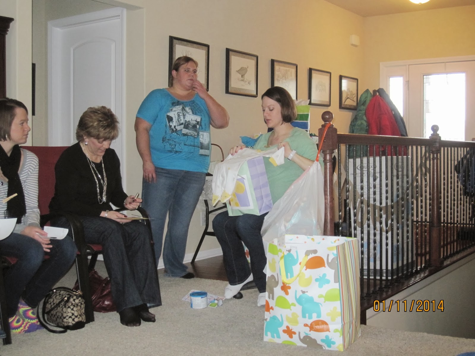 As one of the games, we all got to taste different baby foods and then we had to write down what it was. Heather won one of the other games so she’s opening her prize.