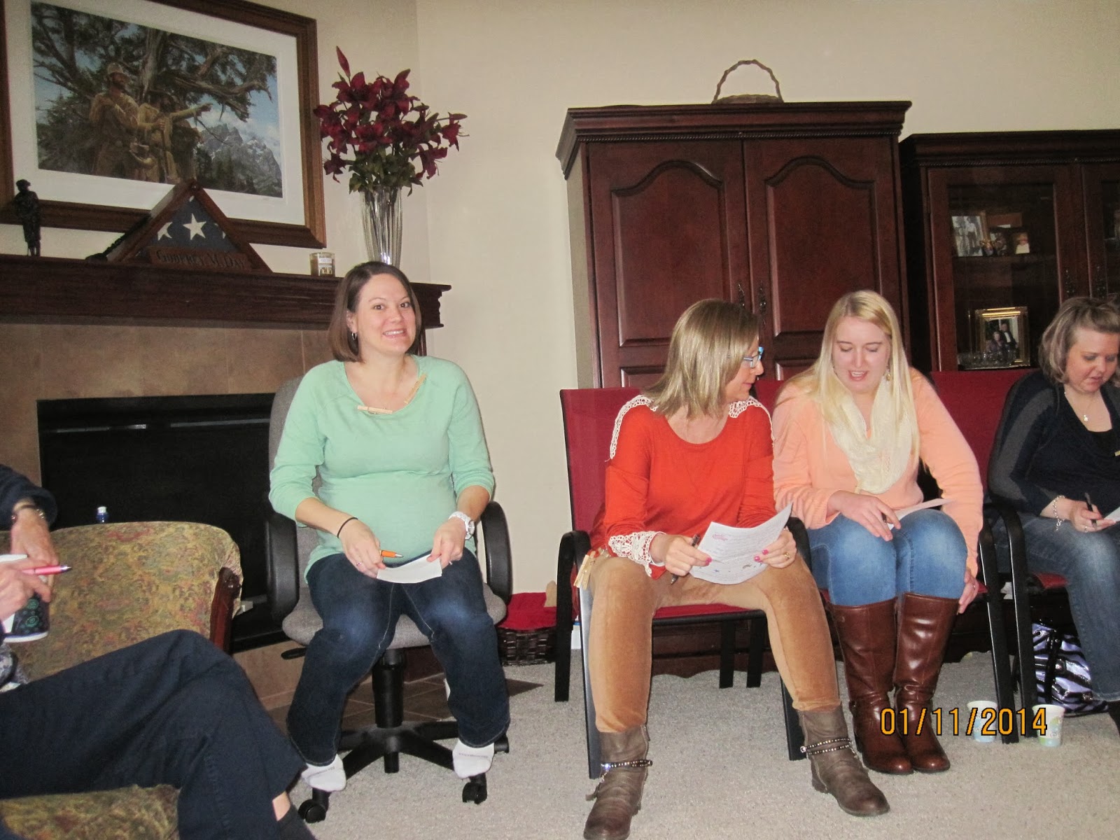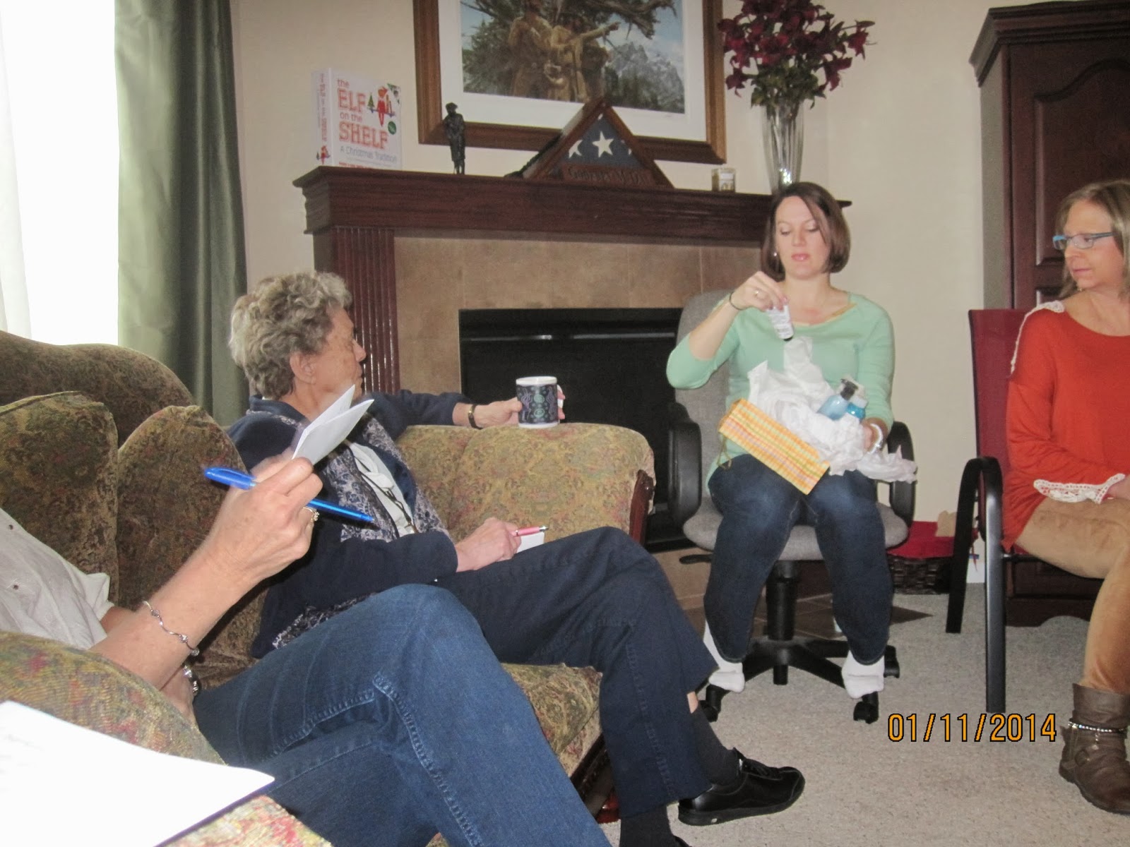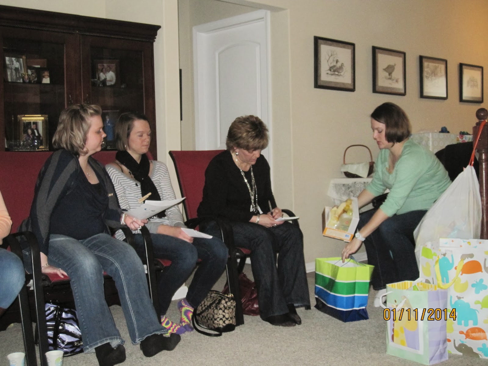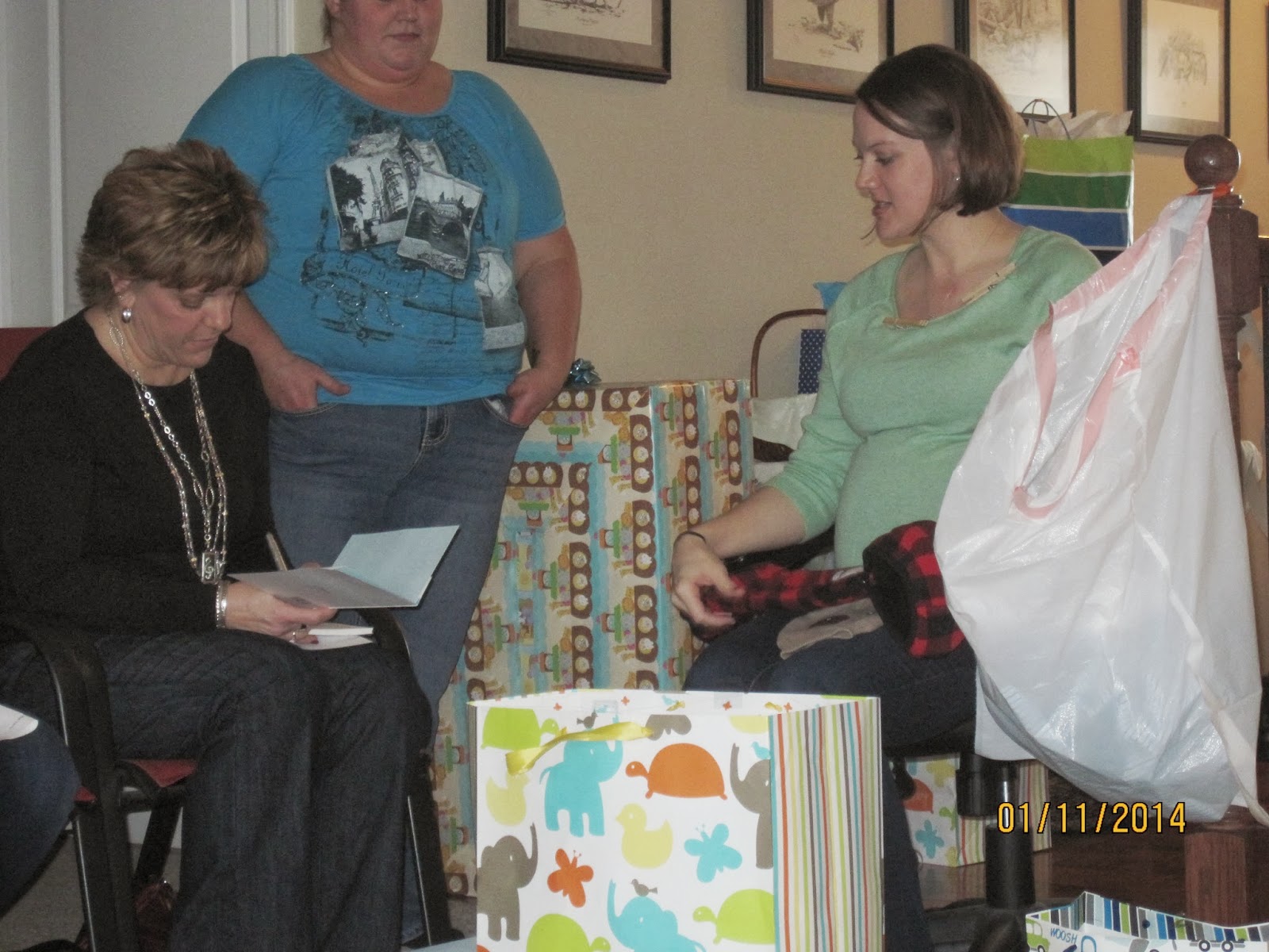 As one of the games, we all got to taste different baby foods and then we had to write down what it was. Heather won one of the other games so she’s opening her prize.