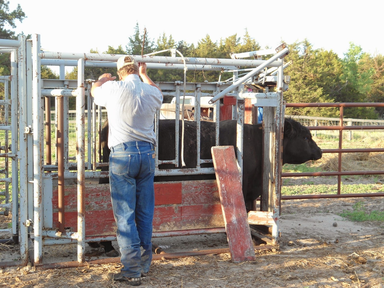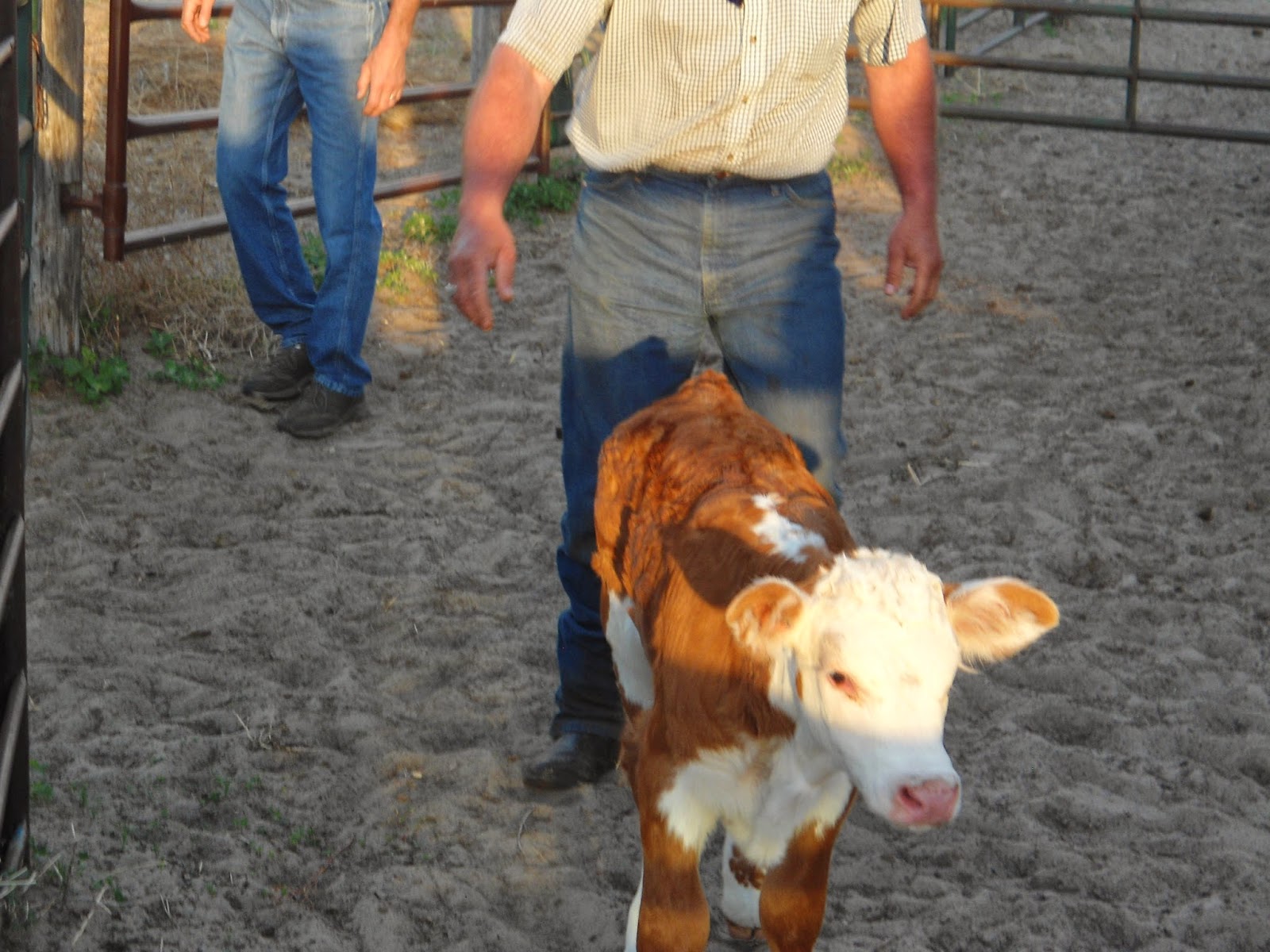 I forgot to mention that Jim and Judy now have cattle of their own. They bought six hereford cows.All but one has had their calf and one of the cows had twins. She didn’t have enough milk for two so they have been bucket feeding one of them. And they bought another cow (Angus) to fill in for the calf’s mama. She’s getting to be quite a pet. This is Ken helping Jim and Judy with branding and vaccinating the youngest calf.