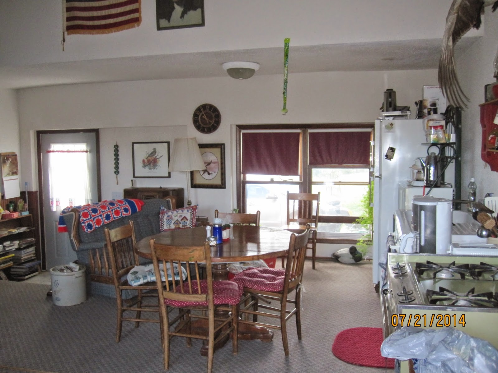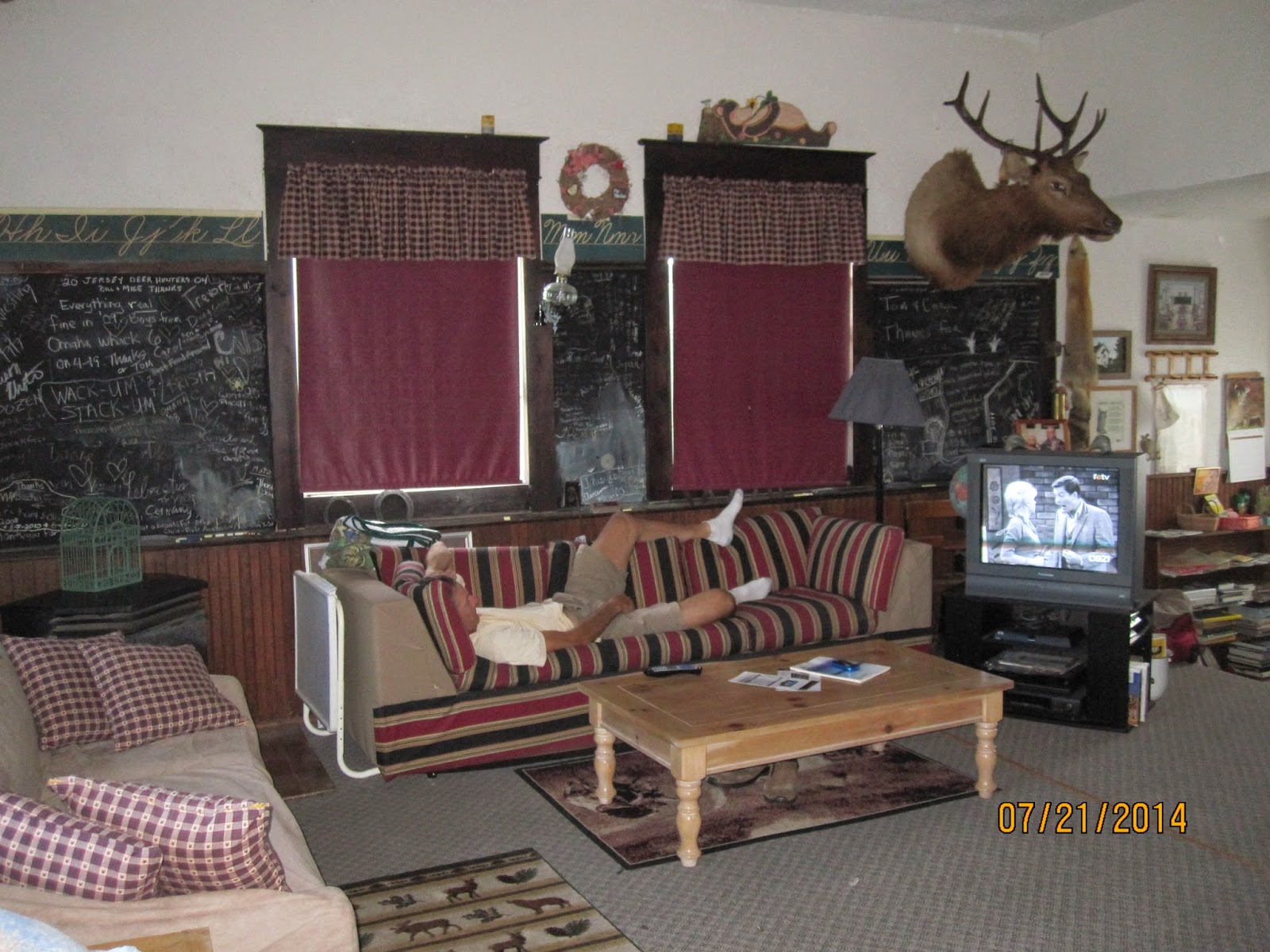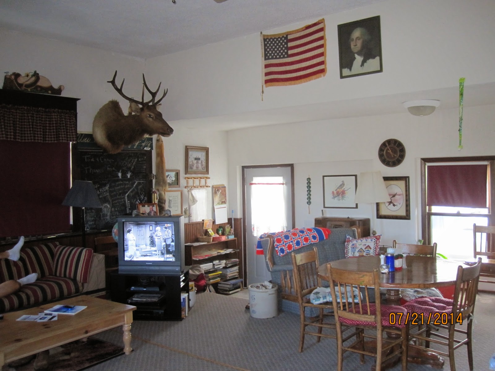 The next room was the largest where the living-room, dining-room and kitchen were. It looked like someone added on to the one side so that there was more living space. Since they have a lot of hunters staying there in the fall, this room was also decorated with deer and elk mounts, along with more old books, an old globe, a picture of the oldest living student and the last student that attended school in that school house.