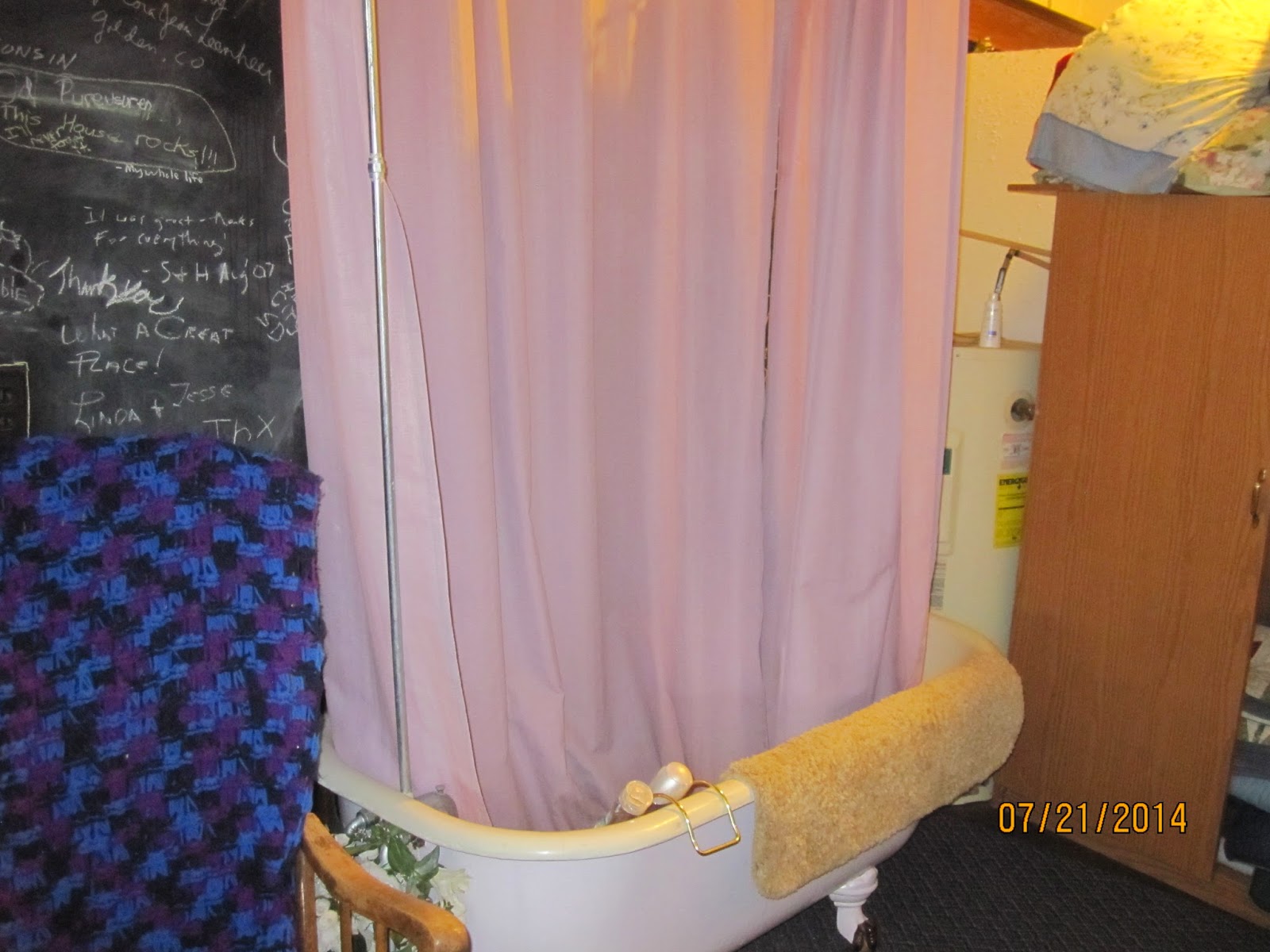 They put another wall in parallel to the bedroom wall and that room was the bathroom. They had an old claw foot bathtub with curtain for showering. There was a chalkboard on the original wall and Carol had added some old school desk in there too.