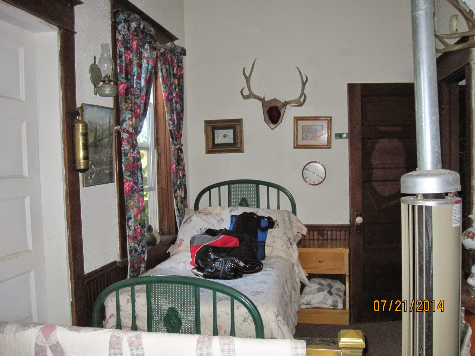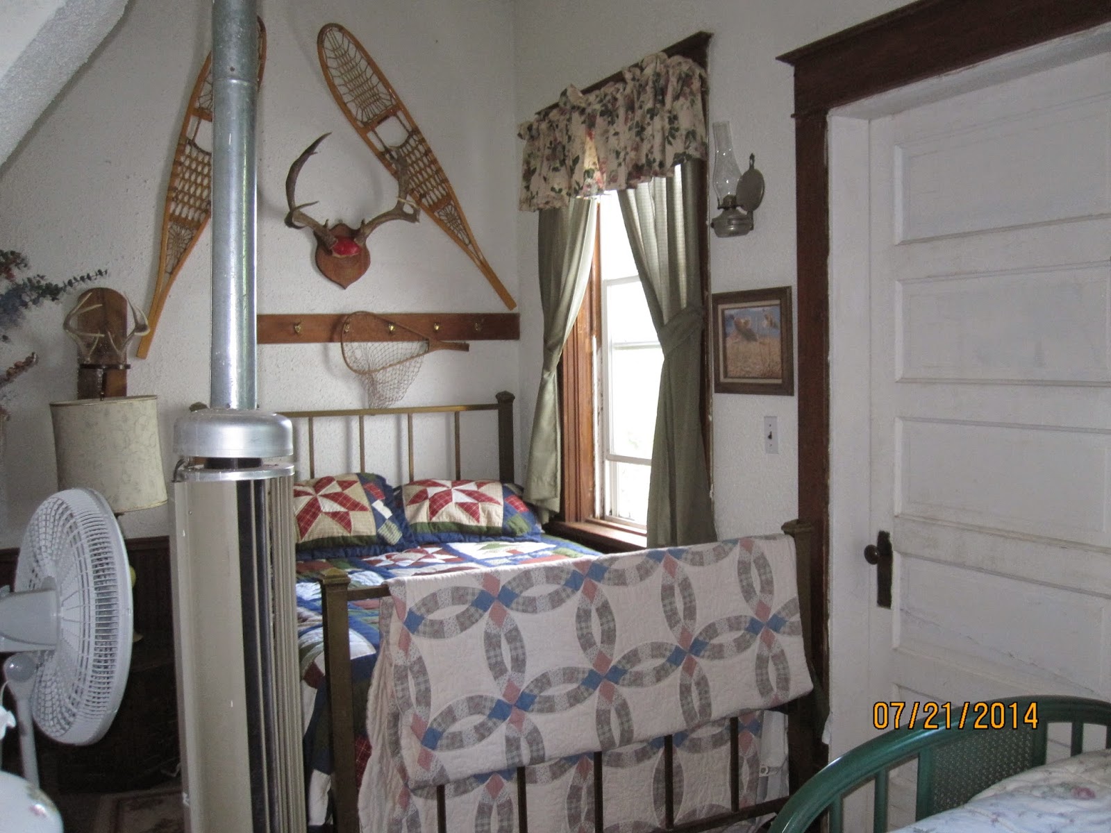 The front door of the old school house was now the back, so the old coat room where the kids hung their coats and the woodstove used to be was now the bedroom. It was very narrow with a full sized bed along one wall and enough room to walk along side of it. At the other end of the room, there was a single bed. It was all tight but not cramped.