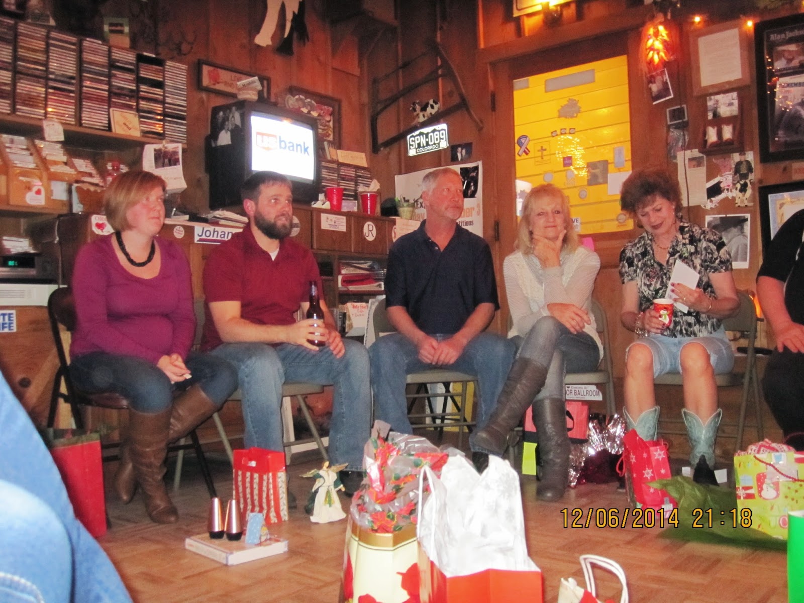 Mark gets to pick another gift because I stole his. Pictured-Chris, Roberta, Bill, Diane and Cindy. |